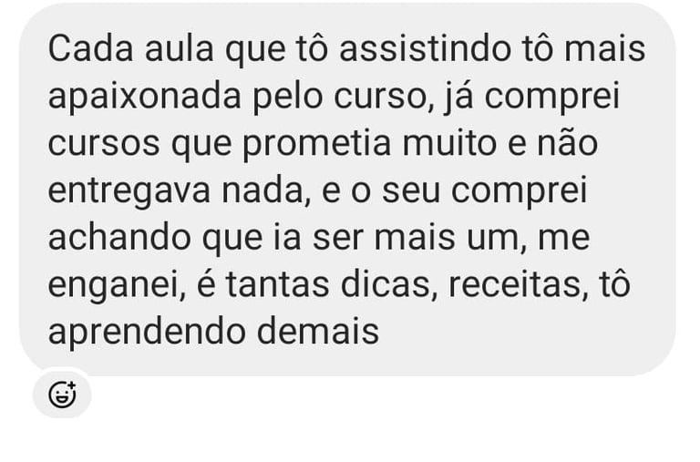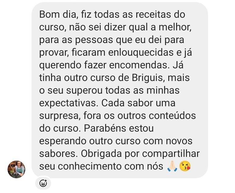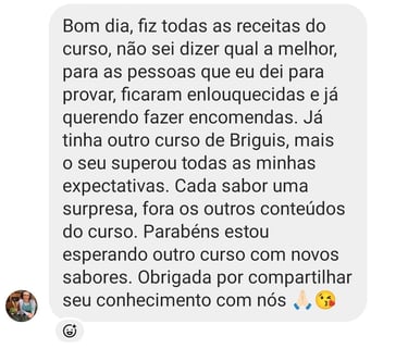Depois de algum tempo, passei a atender apenas eventos e selecionar meus clientes. Minha proposta é lucrar muito, mas com muita qualidade de vida. E isso que eu considero tão importante, comecei a ensinar para minhas alunas. Montei meu primeiro curso, o Embalagens que Harmonizam, pois as embalagens fazem total diferença na diferenciação do produto e muita gente me pedia. Depois, Fiz o curso A Arte do Brigadeiro, com sabores diferenciados, e foi um tremendo sucesso! E mais recentemente abri vagas para o Brigadeiros Clássicos, com sabores tradicionais, mas utilizando minhas técnicas que fazem toda a diferença.